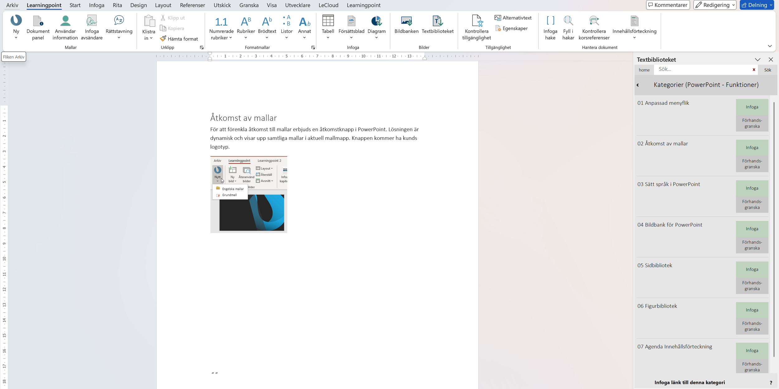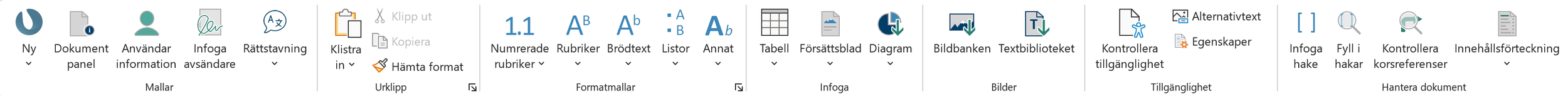 Ett av våra mest uppskattade verktyg i Word är en anpassad mallknapp som gör det enkelt för alla på företaget att hitta era gemensamma mallar. Vi skapar även en företagsanpassad flik där ni enkelt hittar andra företagsspecifika funktioner.