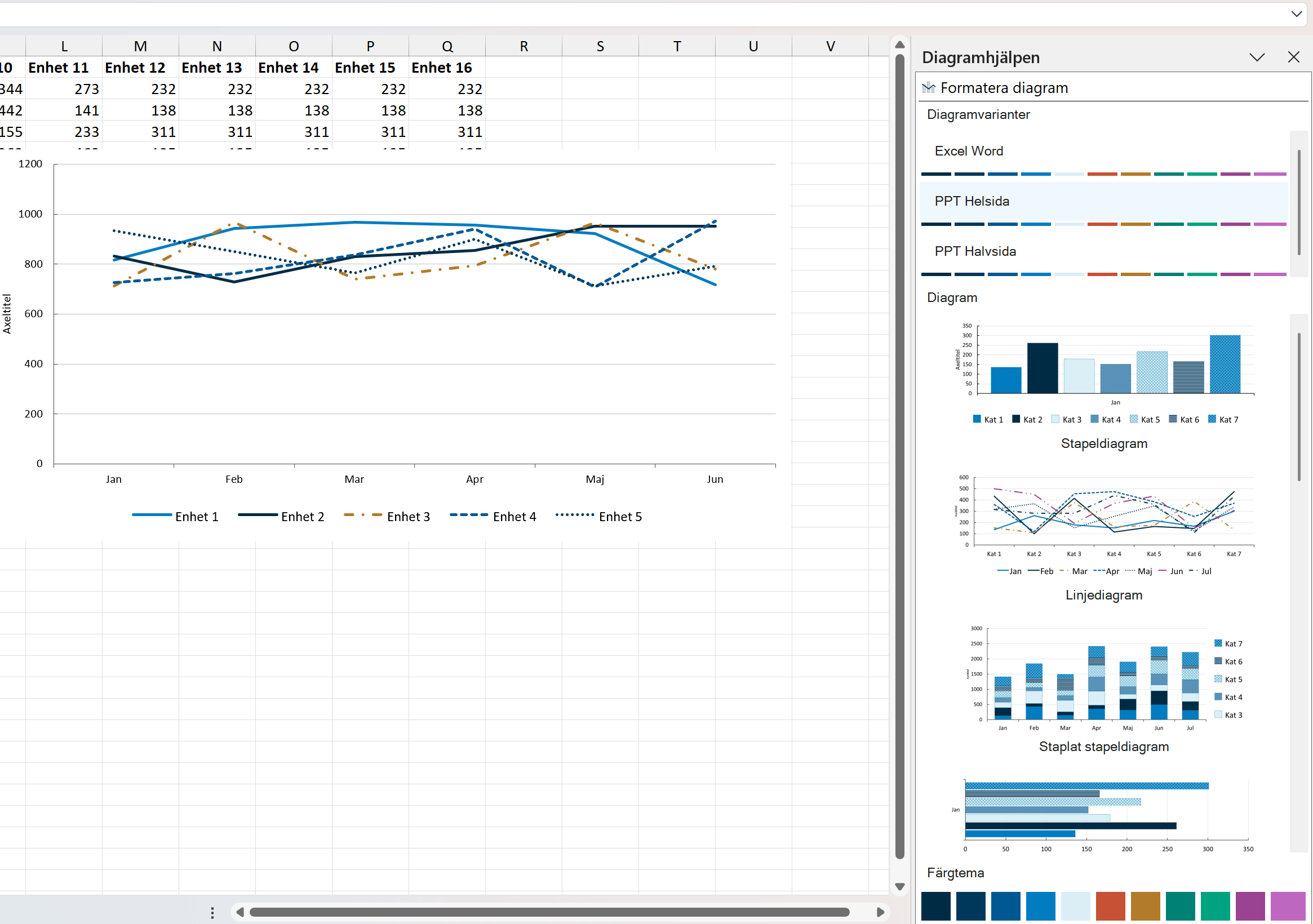 Diagramhjälpen gör det lätt att skapa snygga och tillgängliga diagram som följer företagets eller organisationens profil i Excel. Diagrammen i diagramhjälpen kan kategoriseras på typer och storlekar så att det blir lätt att hitta rätt diagram för rätt ändamål. Det här är en av våra mest uppskattade funktioner. Diagram i rätt storlek, anpassade för era presentationer i PowerPoint eller dokument och rapporter i Word, infogas enkelt och ger ett tydligt och professionellt intryck.