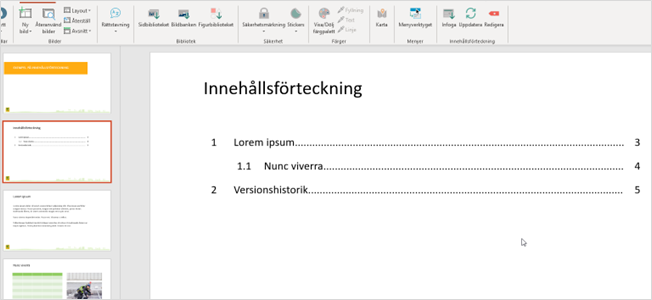Detta är en funktion som skapar en länkad innehållsförteckning för aktuell presentation, och den fungerar även om PowerPoint-presentationen konverteras till PDF-format. Innehållsförteckningen listar presentationens rubriker för valda sidor och dess sidnummer. Användaren kan enkelt välja vilka sidor och nivåer (1–3) som ska visas. Via funktionsknappar kan innehållsförteckningen enkelt redigeras och uppdateras. Det här är ett verktyg som underlättar ert arbetet med att skapa smarta och tydliga presentationer.