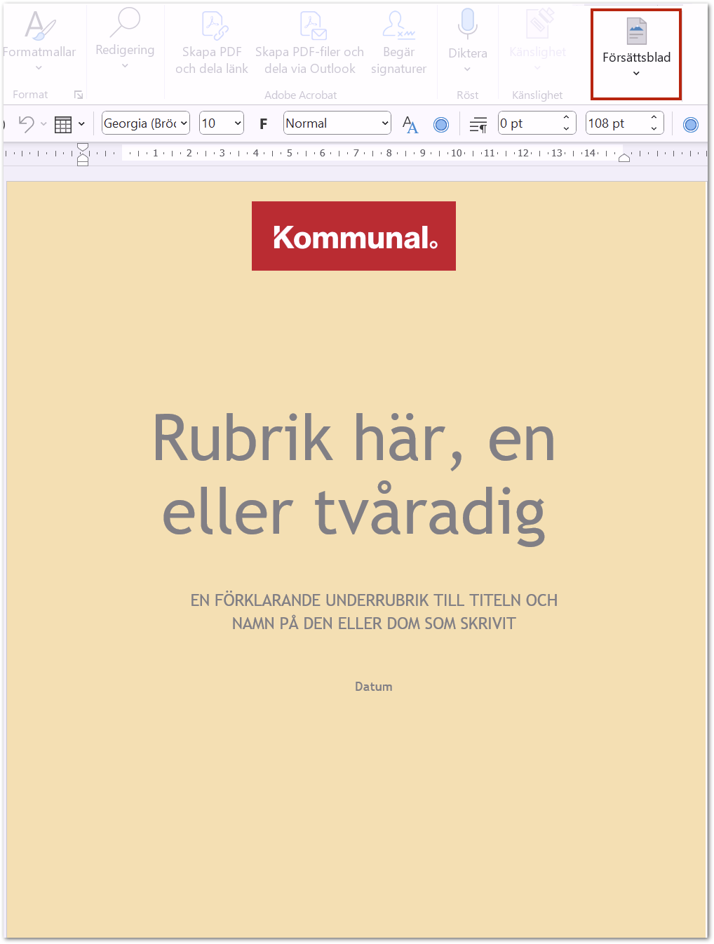Önskar ni att alla på företaget eller i organisationen enkelt ska kunna infoga kundspecifika försättsblad i dokumenten? Vi hjälper er att utveckla och lägga upp era kundspecifika försättsblad under en egen knapp i menyfliksraden, vilket gör det enkelt att infoga i ett befintligt dokument.
