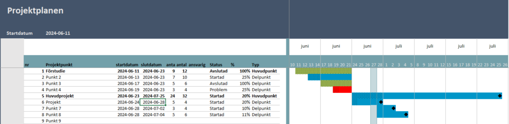 Vill ni istället se det som ett Gantt-schema, kan samma tabell användas till detta.
