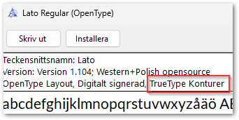 OpenType (OTF): Nyare format med fler funktioner. Har generellt bra stöd i Office men kan ofta inte bäddas in korrekt i PDF-filer.